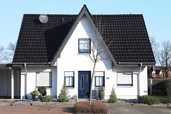 Elewacja: gładka, tynkowana w kolorze jasnym z kontrastującymi elementami stolarki